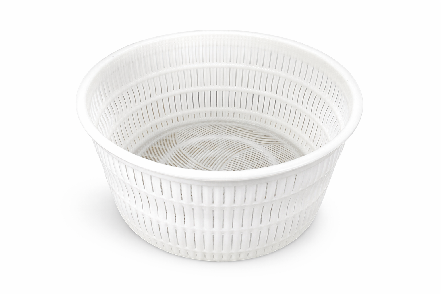 Molds for the production of large cheeses. These molds allow for the production of large cheeses without the need for a press. Due to their size, the cheeses drain perfectly under their own weight. The mold effectively drains the whey and leaves an interesting pattern on the cheese.