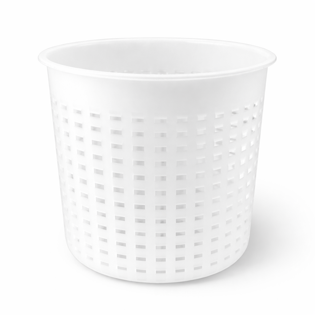 Universal cheese mold for fresh rennet cheeses, cottage cheese, and ricotta. The slightly rounded bottom allows for making cheese with rounded edges.