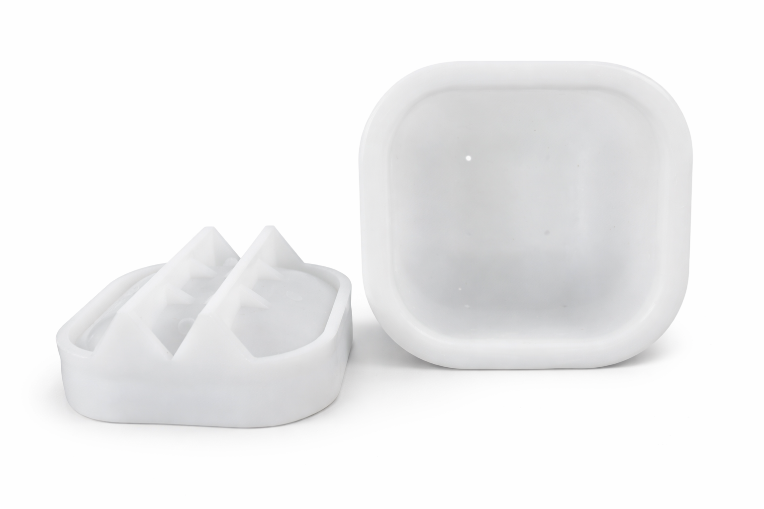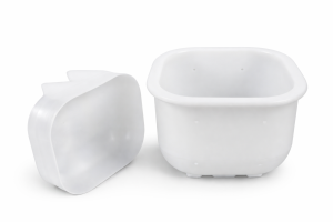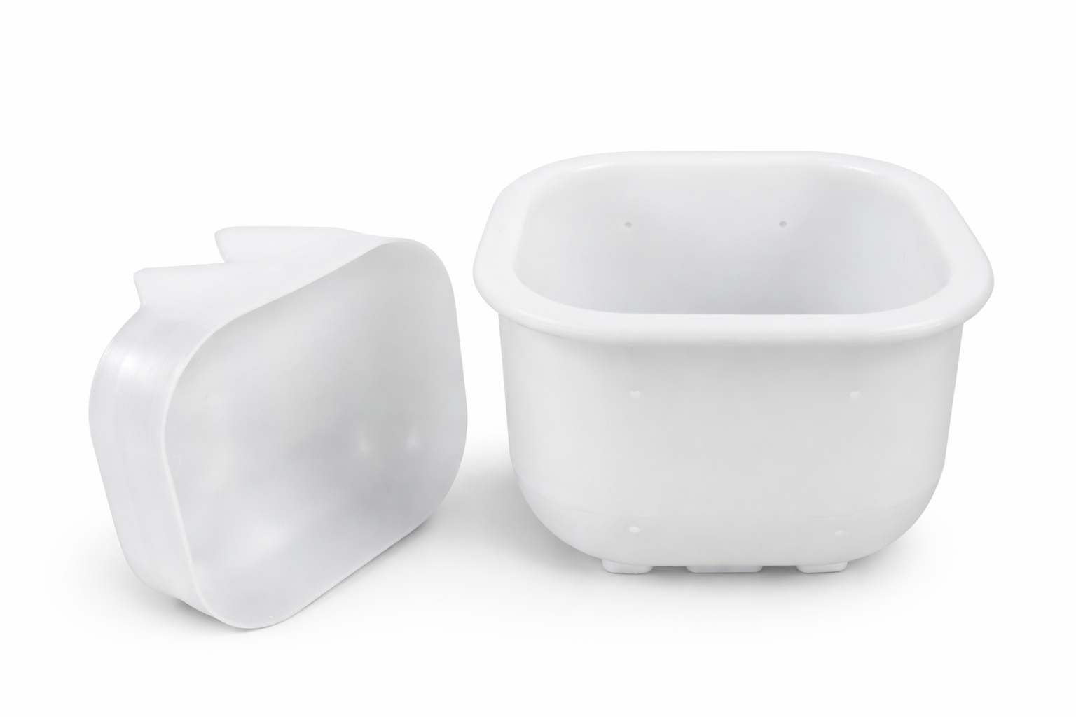Made of durable plastic, featuring rounded edges on the bottom and lid, with a small number of holes. For proper whey drainage, a cheese cloth is required.